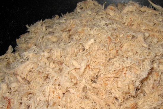 thu gom bă sắn dây từ cơ sở lọc bột sắn thuê về ép, phơi khô, đánh bông, tẩm gia vị, xào cho vàng, trộn